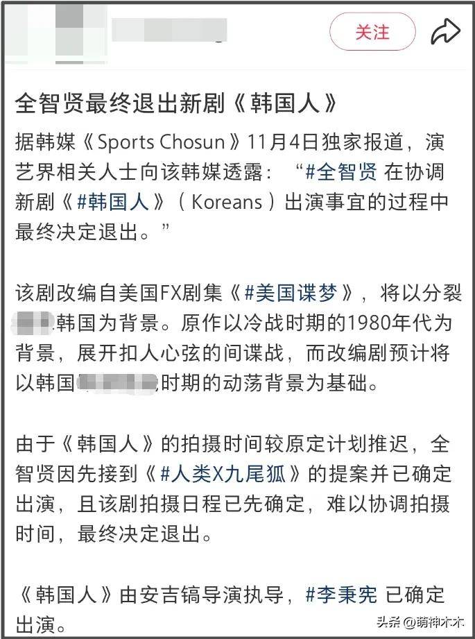 剧集首播即是爆开,二是确认退出新剧《韩国人》拍摄。目前《人类X九尾狐》确认了拍摄时间。