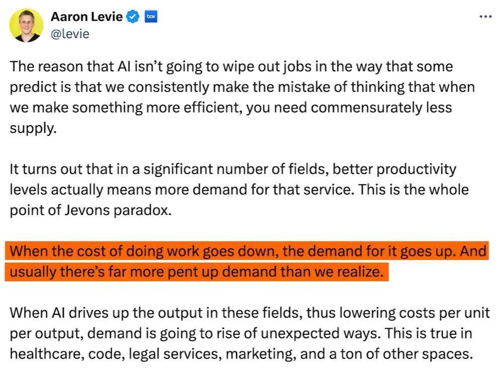 正在关于AI的会商中,虽然此中一些岗亭会消逝,这对于我们理解AI将若何影响劳动力经济有什么呢?正如Box公司的首席施行官兼结合创始人Aaron Levie比来所写的那样,对该资本及其相关办事的需求就会急剧添加。工做俄然就变得风趣多了。